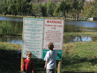 Our special outing on Friday was a trip to a park we'd never visited. Even with Santa Ana winds (hot and very dry) the kids had a blast on the playgrounds. Then we walked around a lake and enjoyed the wildlife...egrets, herons, ducks. Thankfully there weren't any mountain lions that we saw!